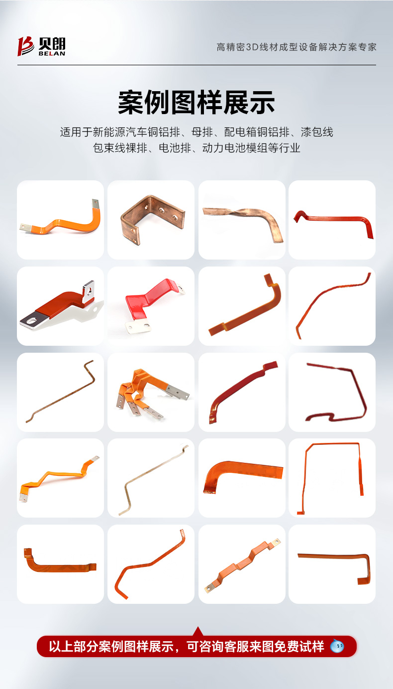 8、該設備是專門針對銅、鋁排自動折彎成型的一款設備,適用于生產:新能源汽車銅鋁排、母排、配電箱銅鋁排、